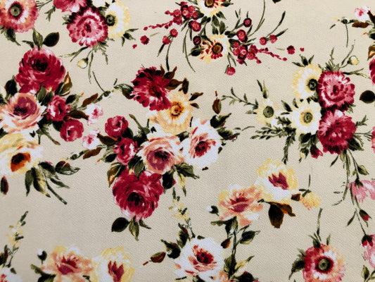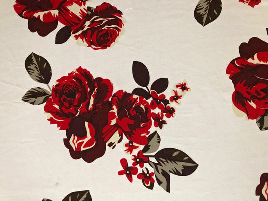 Liverpool Knit – Red/Burgundy/Olive Vintage Rose Cluster Floral on Ivory – 4-Way Stretch, 56” Wide, 200 GSM – Sold by the Yard (LVPR313)
