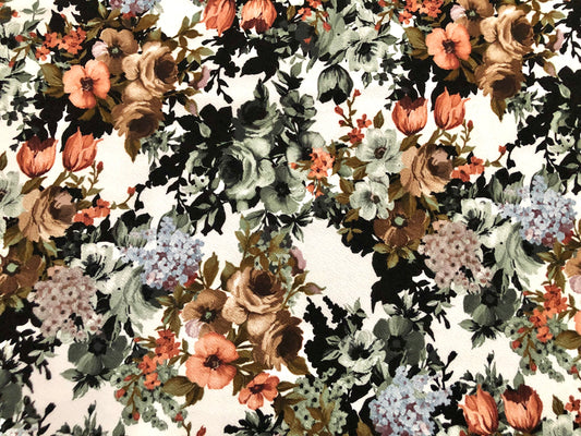 Liverpool Knit – Coral/Brown/Gray on Ivory Bouquet Floral – 4-Way Stretch, 56″ Wide, 200 GSM – Sold by the Yard (LVPR007)