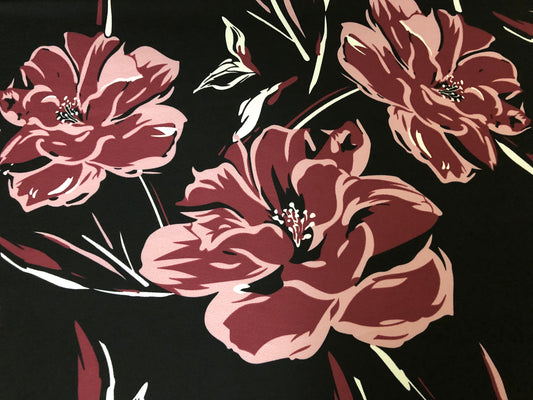 Liverpool Knit – Mauve& Blush Oversized Hibiscus Floral on Black, 4-Way Stretch, 56” Wide, 200 GSM – Sold by the Yard (LVPR311)