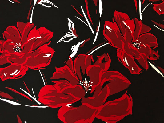 Liverpool Knit – Red & Crimson Oversized Hibiscus Floral on Black – 4-Way Stretch, 56” Wide, 200 GSM – Sold by the Yard (LVPR312)