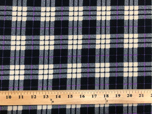 Liverpool Knit Fabric — Navy, Ivory & Purple Tartan Plaid — 56" Wide, 200 GSM, 4-Way Stretch, Double Knit — Sold by the Yard (LVPR214)
