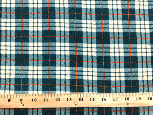 Liverpool Knit Fabric — Teal, Ivory & Orange Tartan Plaid — 56" Wide, 200 GSM, 4-Way Stretch Double Knit — Sold by the Yard (LVPR215)