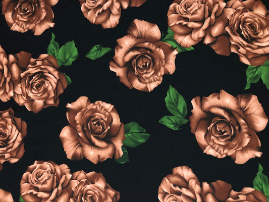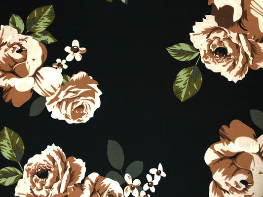 Liverpool Knit – Mocha Brown Roses with Green Leaves Antique Rose Bouquet on Black – 4-Way Stretch, 56" Wide, 200 GSM – Sold by the Yard (LVPR322)