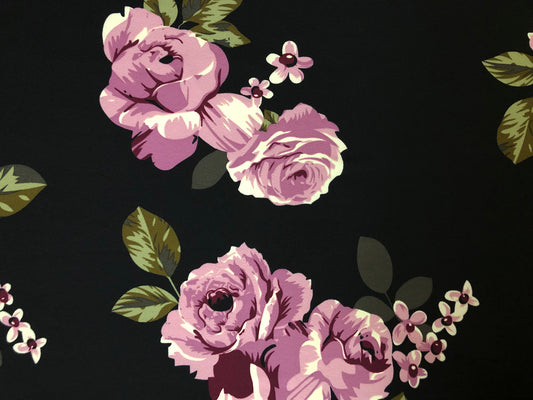 Liverpool Knit – Purple & Mauve Climbing Rose Floral on Black – 4-Way Stretch, 56” Wide, 200 GSM – Sold by the Yard (LVPR317)
