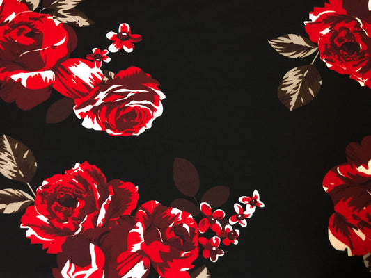 Liverpool Knit – Red/Crimson/Ivory Vintage Cluster Rose Floral on Black – 4-Way Stretch, 56” Wide, 200 GSM – Sold by the Yard (LVPR316)