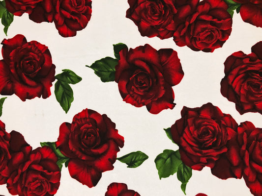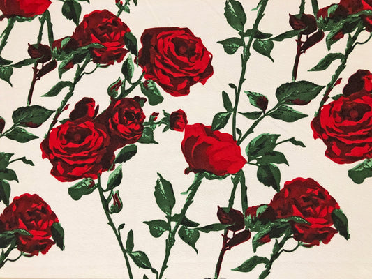 Liverpool Knit – Red with Green Leaves Antique Rose Bouquet on Ivory – 4-Way Stretch, 56” Wide, 200 GSM – Sold by the Yard (LVPR321)