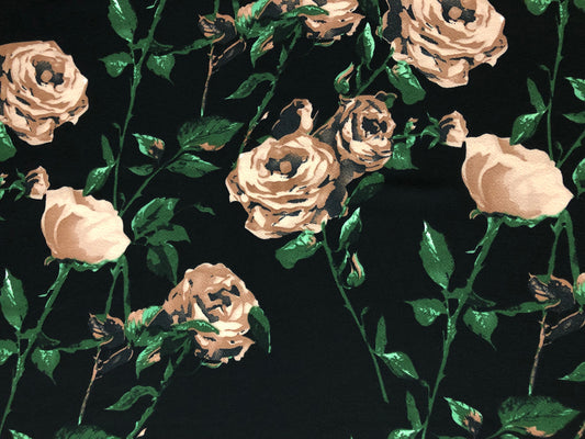 Liverpool Knit – Brown/Taupe/Olive Climbing Rose Floral on Black – 4-Way Stretch, 56” Wide, 200 GSM – Sold by the Yard (LVPR318)