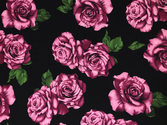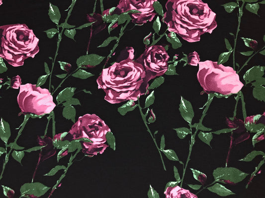 Liverpool Knit – Pink/Mauve Roses with Green Leaves Antique Rose Bouquet on Black – 4-Way Stretch, 200 GSM, 56" Wide – Sold by the Yard (LVPR323)