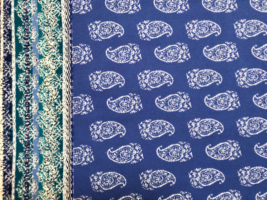 Liverpool Knit — Royal Blue & White Paisley Teal Borders — 56″ Wide, 200 GSM, 4-Way Stretch — Sold by the Yard (LVPR232)