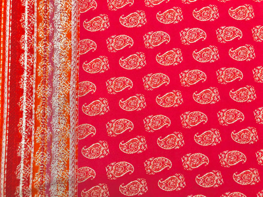 Liverpool Knit — Raspberry Red & White Paisley Orange Borders — 56″ Wide, 200 GSM, 4-Way Stretch — Sold by the Yard (LVPR233)
