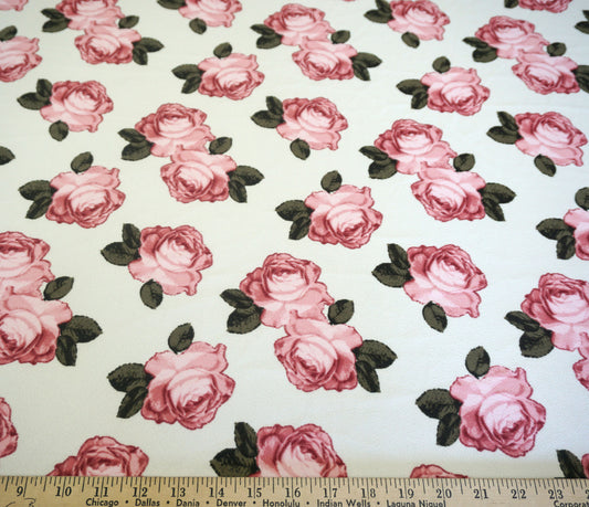 Liverpool Knit – Pink Roses & Green Leaves on Ivory Floral – 4-Way Stretch, 56″ Wide, 200 GSM – Sold by the Yard (LVPR018)