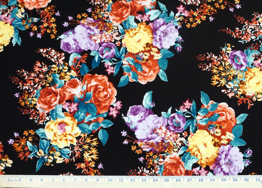 Liverpool Knit – (Coral/Yellow/Purple/Teal) Brown Bouquet Floral – 4-Way Stretch, 56″ Wide, 200 GSM – Sold by the Yard (LVPR027)