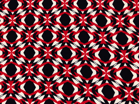 Liverpool Knit Fabric — Red, Black & White Geometric Kaleidoscope — 4-Way Stretch, 56″ Wide, 200 GSM — Sold by the Yard (LVPR348)