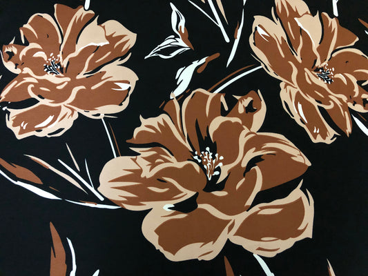 Liverpool Knit – Brown Oversized Hibiscus Floral on Black, 4-Way Stretch, 56” Wide, 200 GSM – Sold by the Yard (LVPR310)