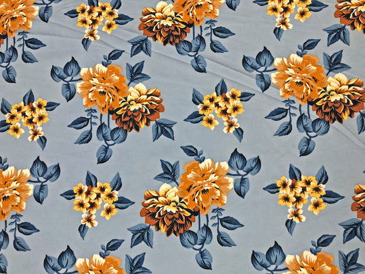 Techno Crepe Knit — Slate Blue Floral/Marigold & Amber Blooms with Navy Leaves, 4-Way Stretch, 240 GSM, 56" Wide, Wrinkle Resistant - By the Yard (TCRP096)