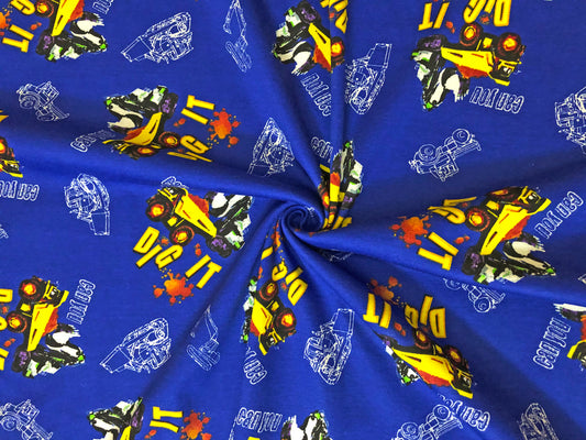 Construction Trucks Cotton – 100% Cotton Print | Non-Stretch, 52″ Wide, “Dig It” Blue – Sold by the Yard (CTJPR06)