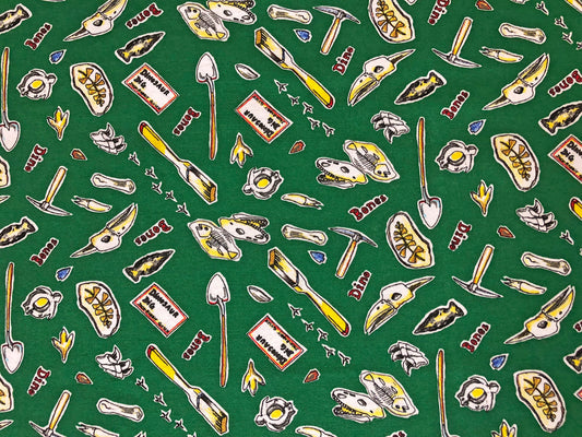 Dino Dig Cotton Print – 100% Cotton | Non-Stretch, 50″ Wide, Green Fossils & Tools – Sold by the Yard (CTJPR03)
