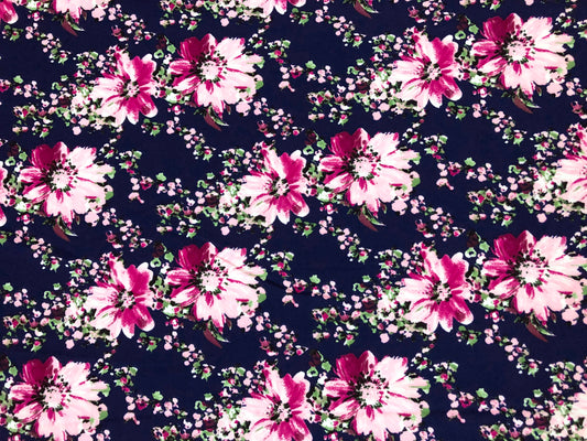 Techno Crepe Knit — Navy Floral/Fuchsia & Blush Blossoms, 4-Way Stretch, 240 GSM, 56" Wide, Wrinkle Resistant - By the Yard (TCRP0102)