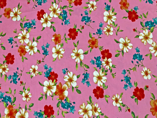 Techno Crepe Knit — Pink Floral/White/Red & Teal Blooms, 4-Way Stretch, 240 GSM, 56" Wide, Wrinkle-Resistant - By the Yard (TCRP091)