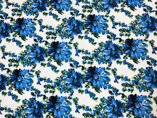 Techno Crepe Knit — White & Blue Floral/Cobalt Blooms with Emerald Sprigs, 4-Way Stretch, 240 GSM, 56" Wide, Wrinkle Resistant - By the Yard (TCRP0103)