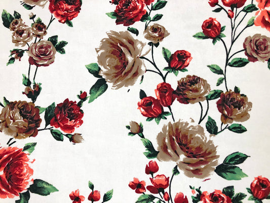 Techno Crepe Knit — White Rose/Brick Red & Taupe Roses with Emerald Leaves, 4-Way Stretch, 240 GSM, 56" Wide, Wrinkle Resistant - By the Yard (TCRP0100)