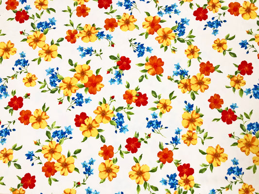 Techno Crepe Knit — White Floral/Sunflower Yellow/Tangerine & Cobalt Blossoms, 4-Way Stretch, 240 GSM, 56" Wide, Wrinkle Resistant - By the Yard (TCRP094)