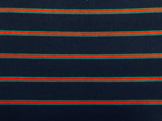 Classic Navy Pinstripe Hacci Sweater Knit – Teal & Red Stripes, 56″ Wide, 95% Polyester 5% Spandex – Sold by the Yard (HSPR028)