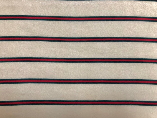 Classic Ivory Pinstripe Hacci Sweater Knit – Teal & Red Stripes, 56″ Wide, 95% Polyester 5% Spandex – Sold by the Yard (HSPR027)