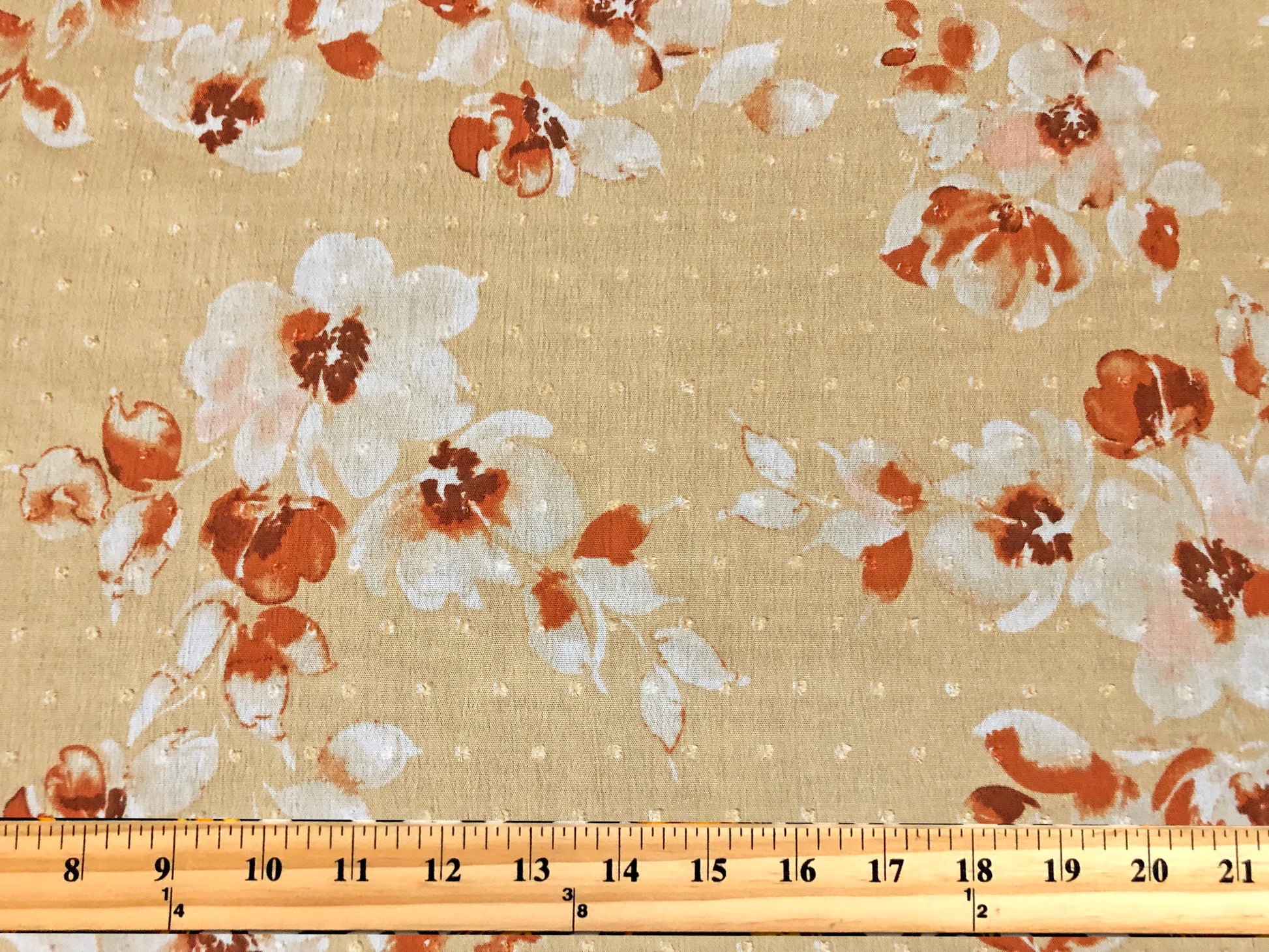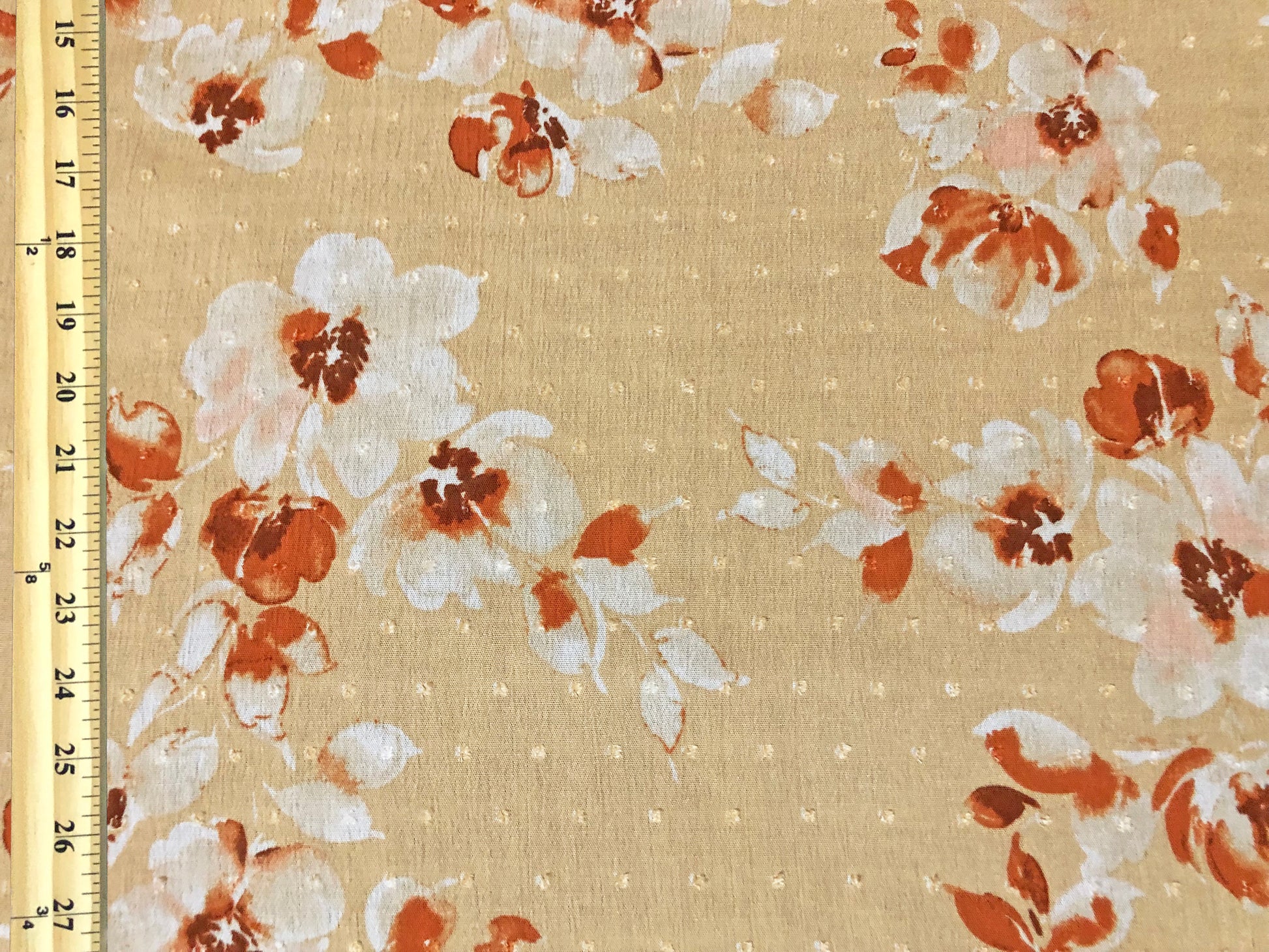 Beige Swiss Dot Rayon Gauze with White/Orange Watercolor Florals — 100% Rayon, 52″ Wide — Fabric by the Yard (RGZPR04)