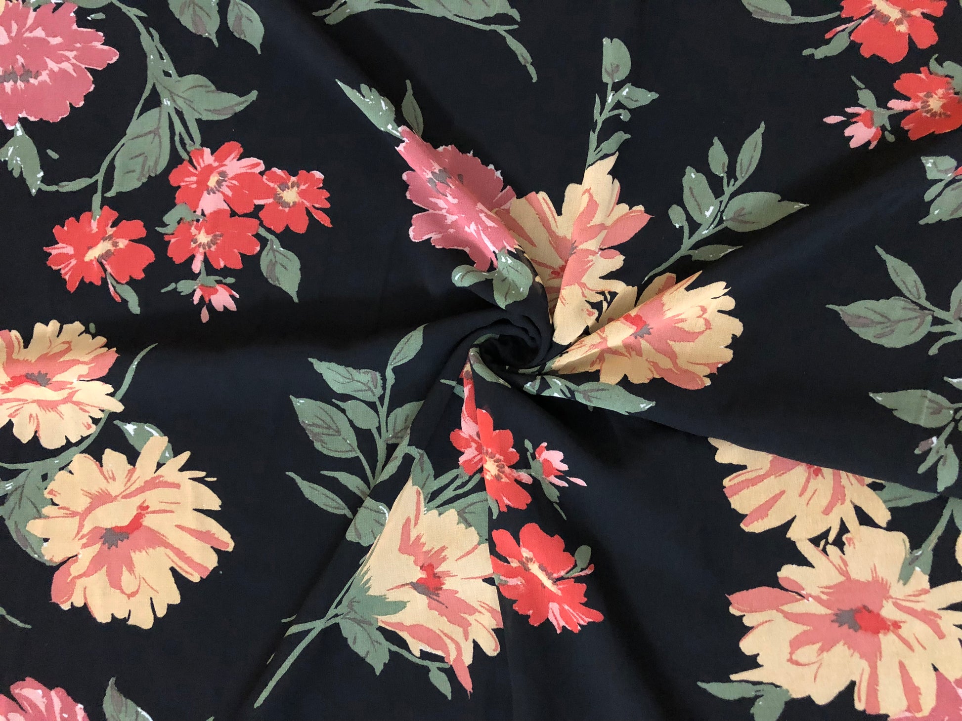 ✨ Feathery-light chiffon on rich black, blooming with butter-yellow, coral, and blush florals and soft sage-green leaves. Sheer with a floaty drape—perfect for statement sleeves, tiered skirts, and dreamy overlays.