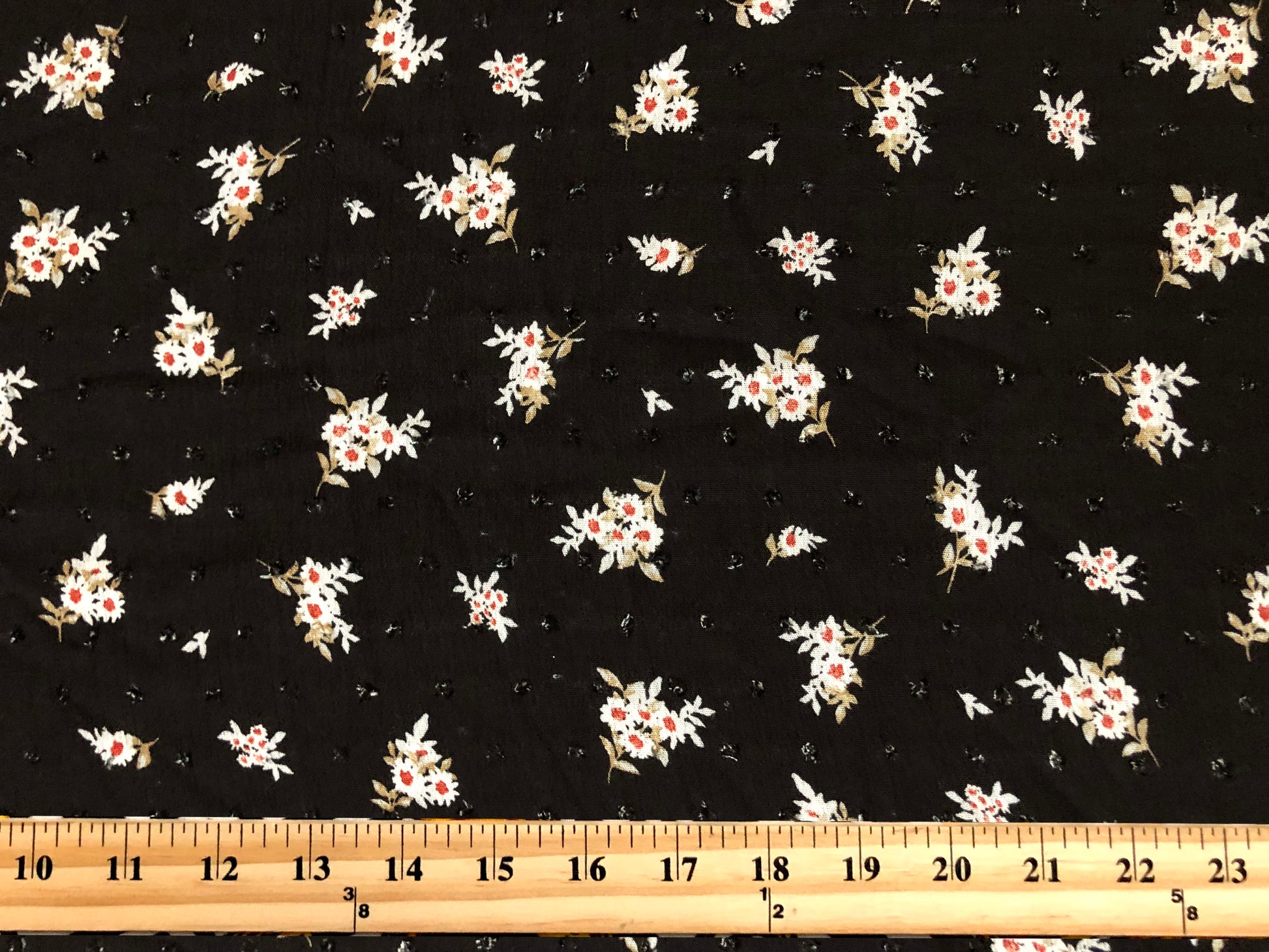 Black Swiss Dot Rayon Gauze with White Ditsy Florals (Tan Leaves, Red Accents) — 100% Rayon, 52″ Wide — Fabric by the Yard (RGZPR012)