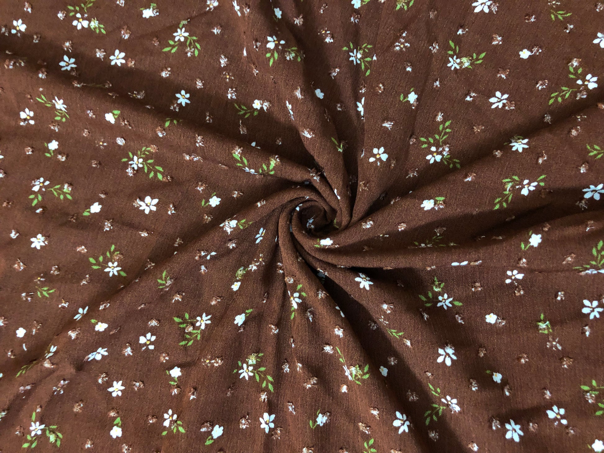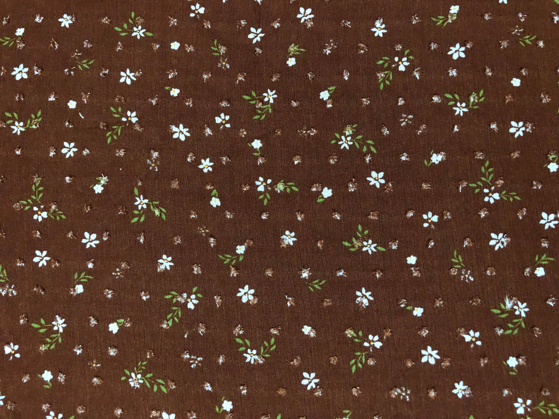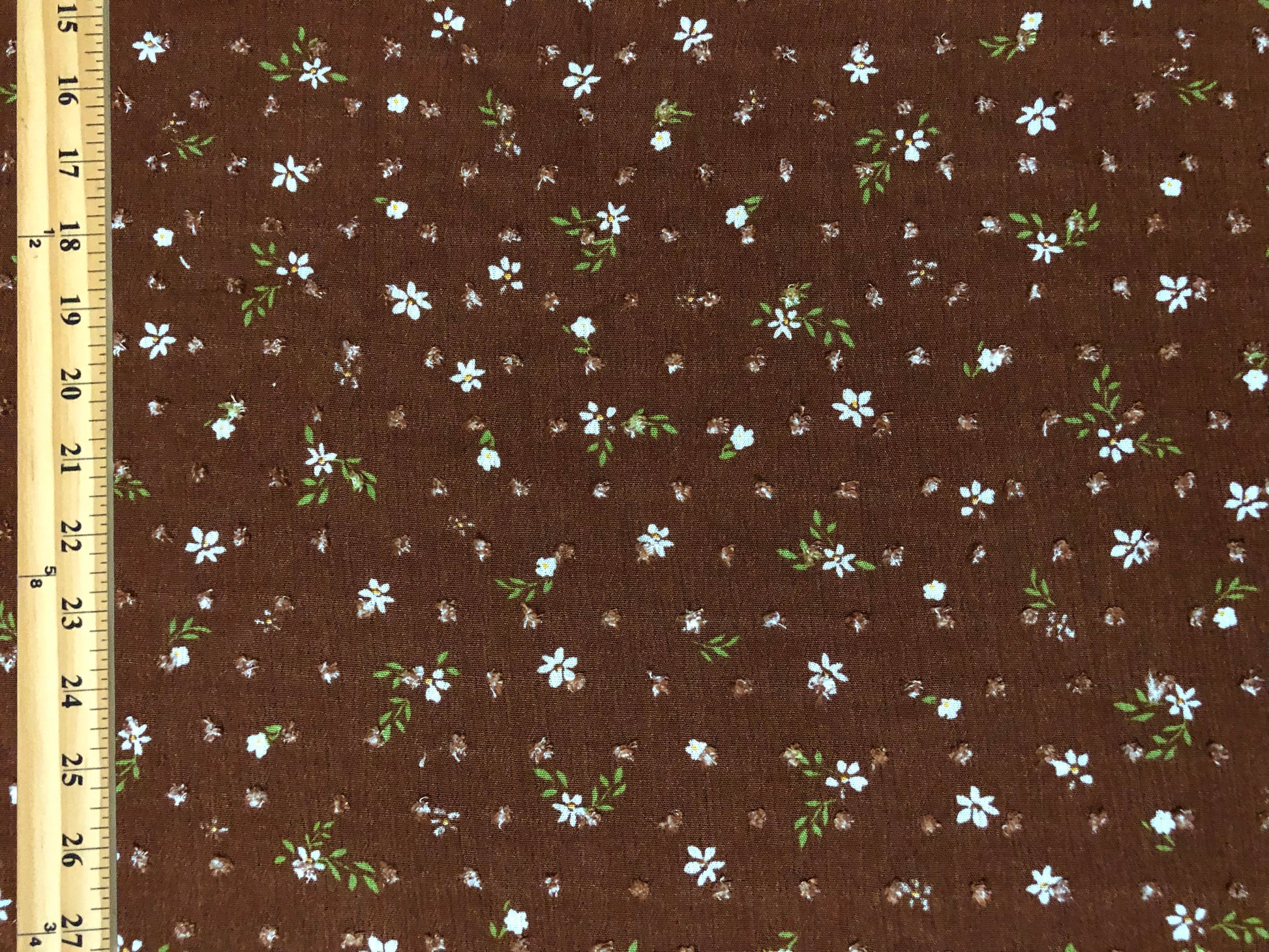 Brown Swiss Dot Rayon Gauze with White Ditsy Florals & Green Leaves — 100% Rayon, 52″ Wide — Fabric by the Yard (RGZPR07)