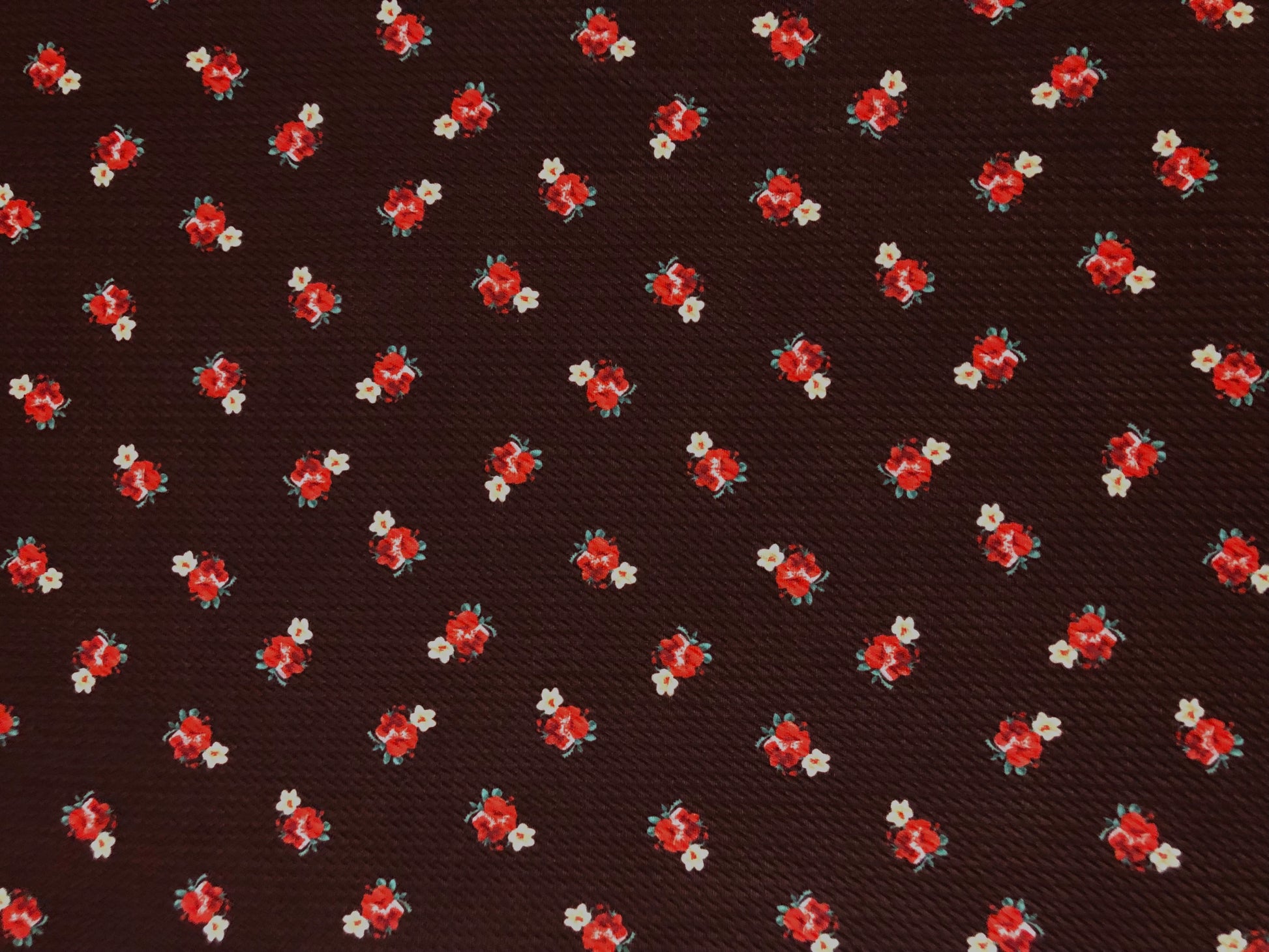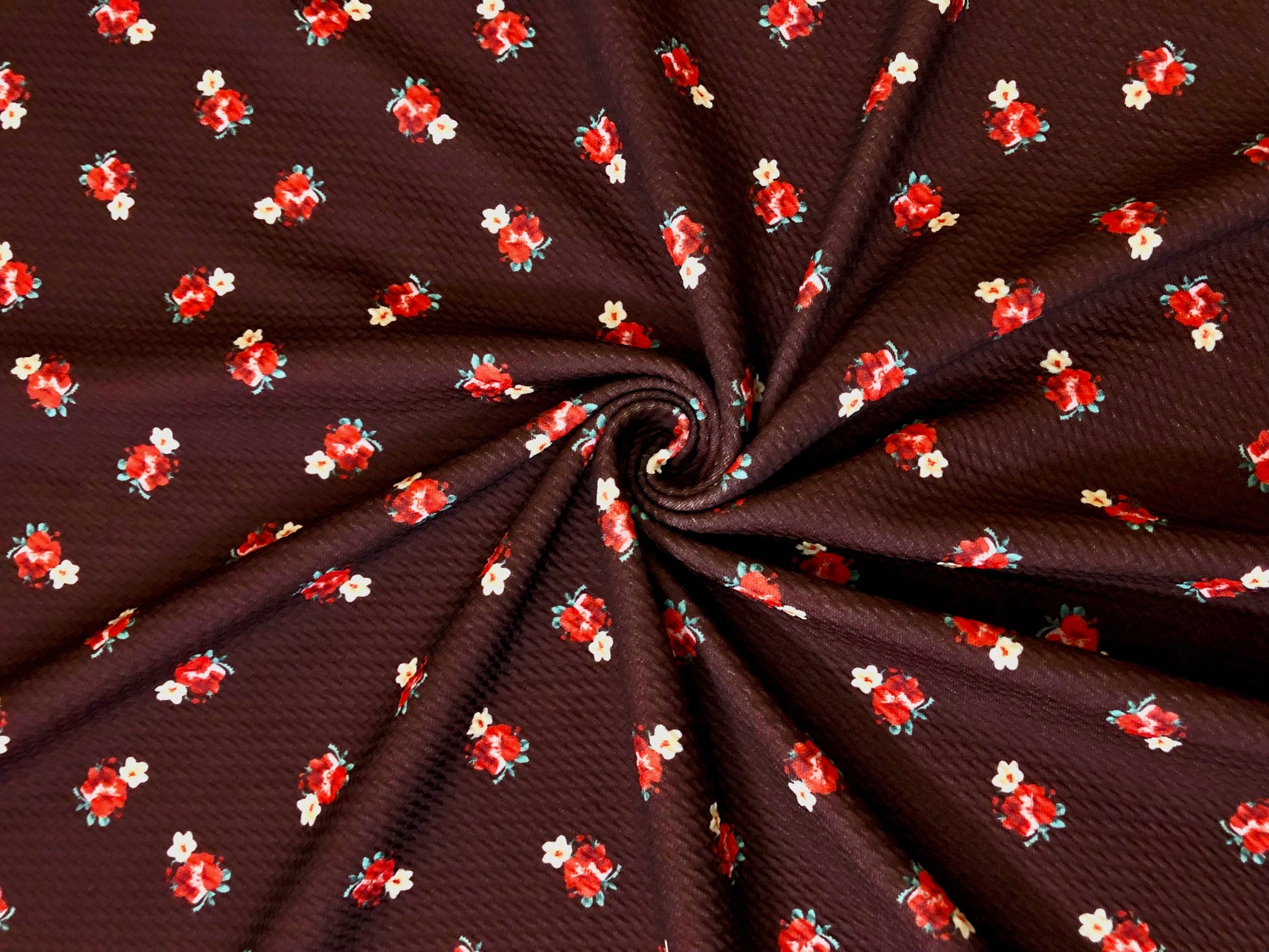 Unleash your creativity with our Bullet Knit Fabric – Mini Red Roses & Yellow Bud Ditsy Floral Stretch Print on Chocolate Brown. This premium Bullet knit features a beautiful print on a uniquely textured surface that adds depth to any project. This fabric is beloved by fashion designers and home sewists alike for its versatility. Create anything from stylish dresses, skirts, and leggings to adorable headbands, bows, and baby outfits – the possibilities are endless