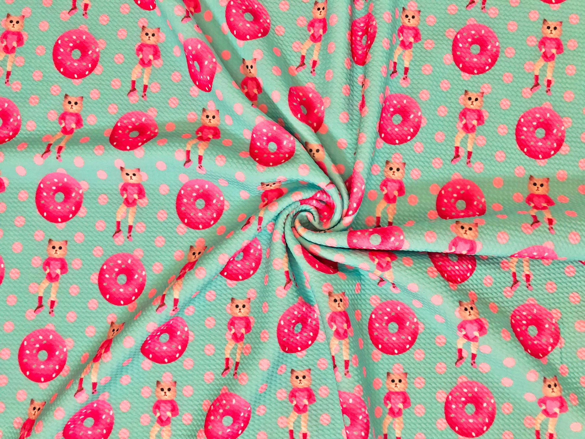 Unleash your creativity with our Bullet Knit Fabric – Mint & Fuchsia Donut Polka Dot Print. This premium Bullet knit features a beautiful print on a uniquely textured surface that adds depth to any project. This fabric is beloved by fashion designers and home sewists alike for its versatility. Create anything from stylish dresses, skirts, and leggings to adorable headbands, bows, and baby outfits – the possibilities are endless