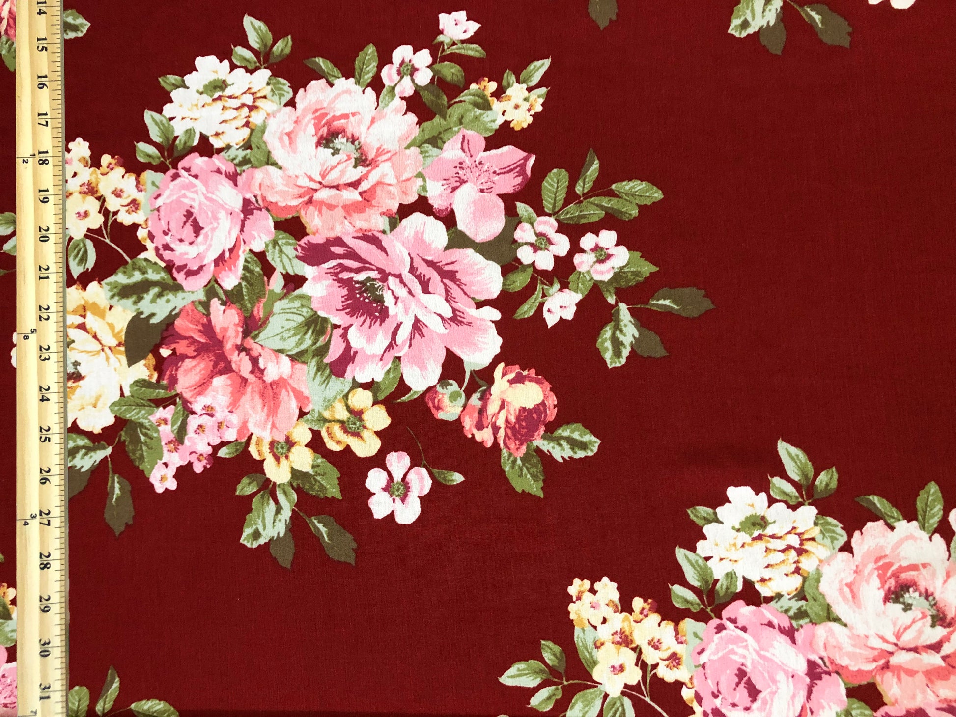 Burgundy Rayon Crinkle with Pink Rose Bouquets & Green Leaves — 100% Rayon, 52″ Wide — Fabric by the Yard (RCKPR05)