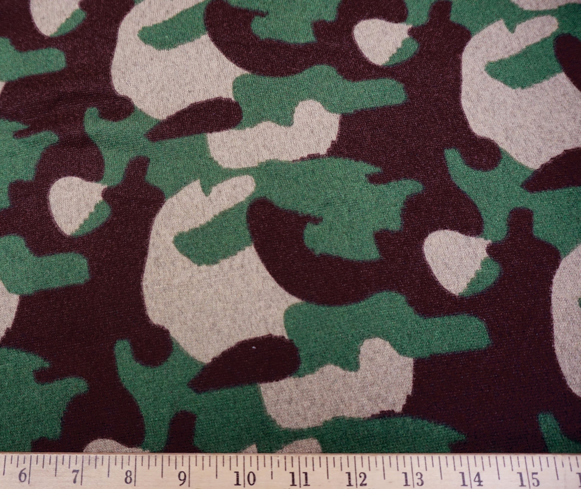 Level up cozy makes with this premium hacci! Soft hand, fluid drape, and comfy stretch deliver lounge-to-street style. The classic green/brown camo print brings bold vibe to cardigans, tees, joggers and beanies. Easy-care 95/5 poly-spandex sews like a dream—beginner friendly, serger approved, and perfect for year-round layers.