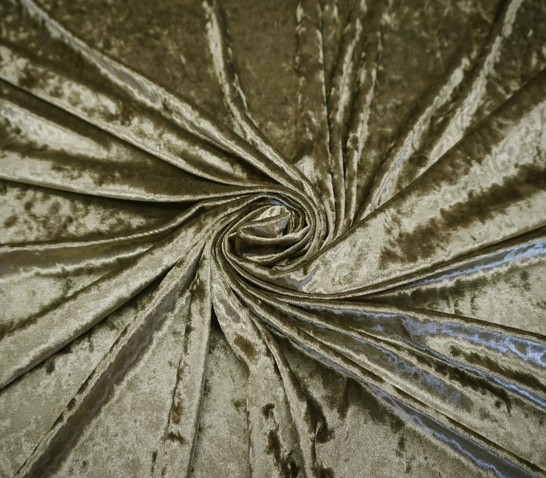 Luxe crushed velvet in Olive with plush sheen and fluid drape that photographs beautifully. 58″ wide, 96/4 poly-spandex adds comfy 2-way stretch—perfect for dresses, cosplay, dancewear and décor without the heavy weight.