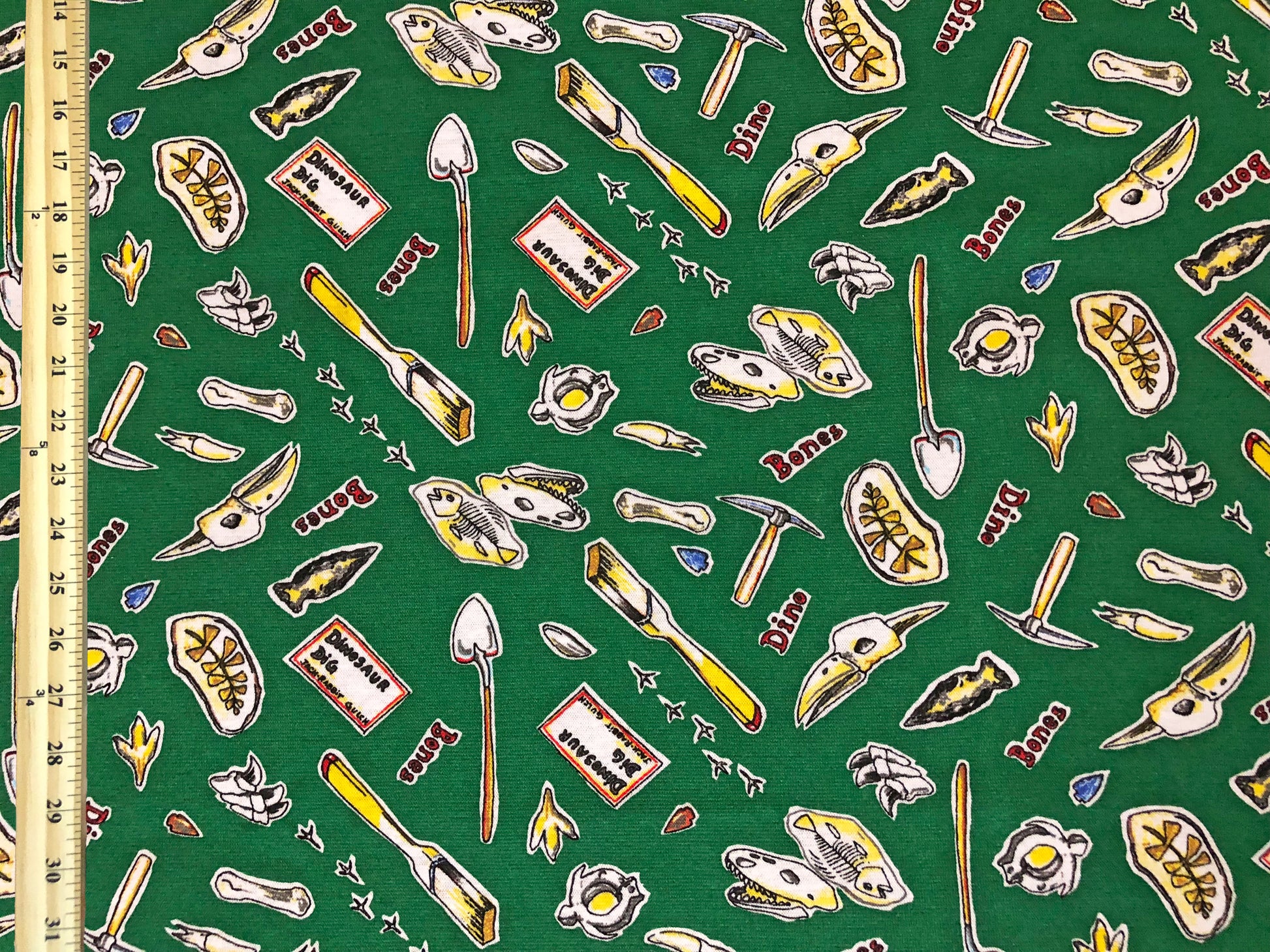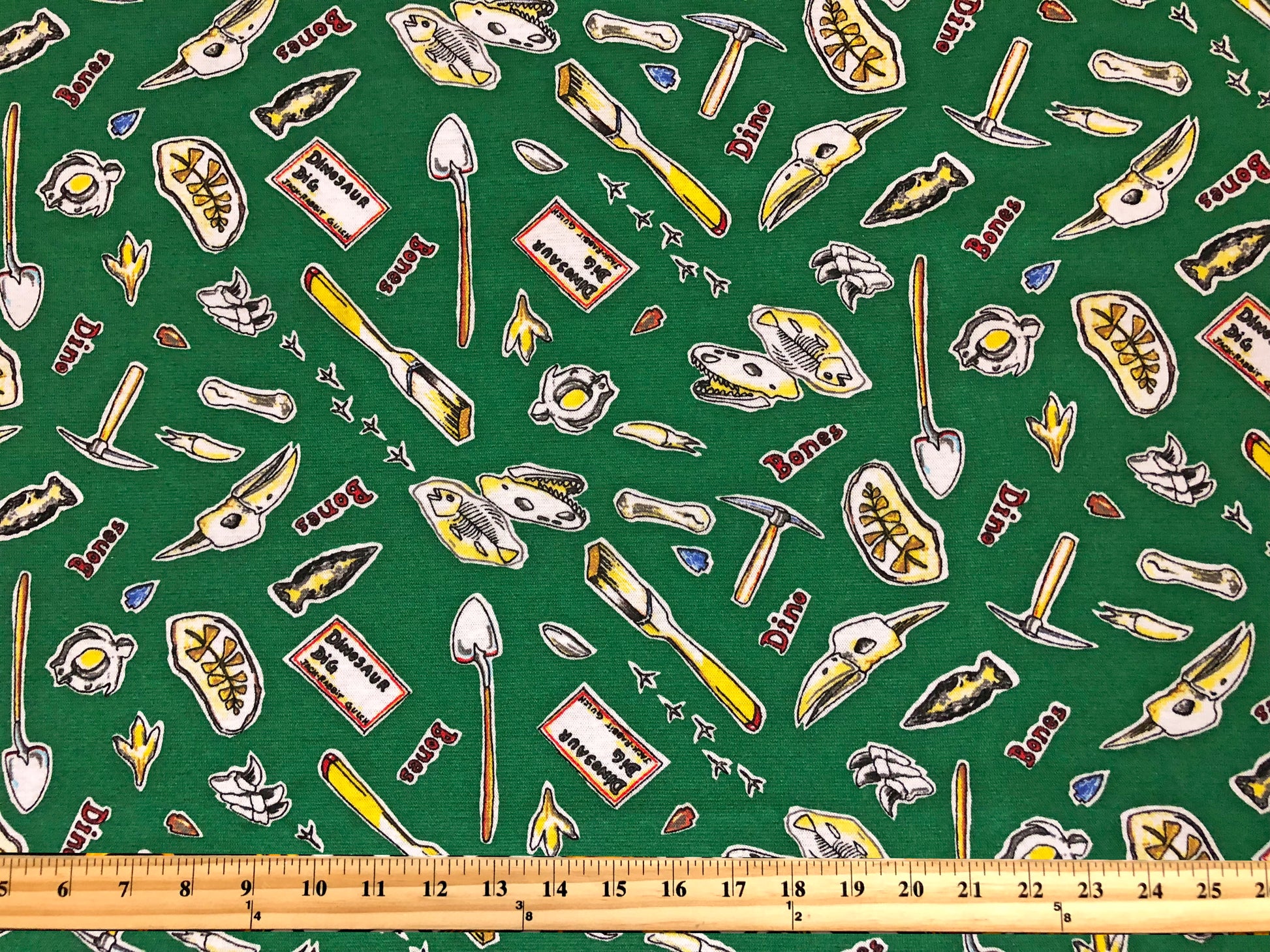 Dino Dig Cotton Print – 100% Cotton | Non-Stretch, 50″ Wide, Green Fossils & Tools – Sold by the Yard (CTJPR03)