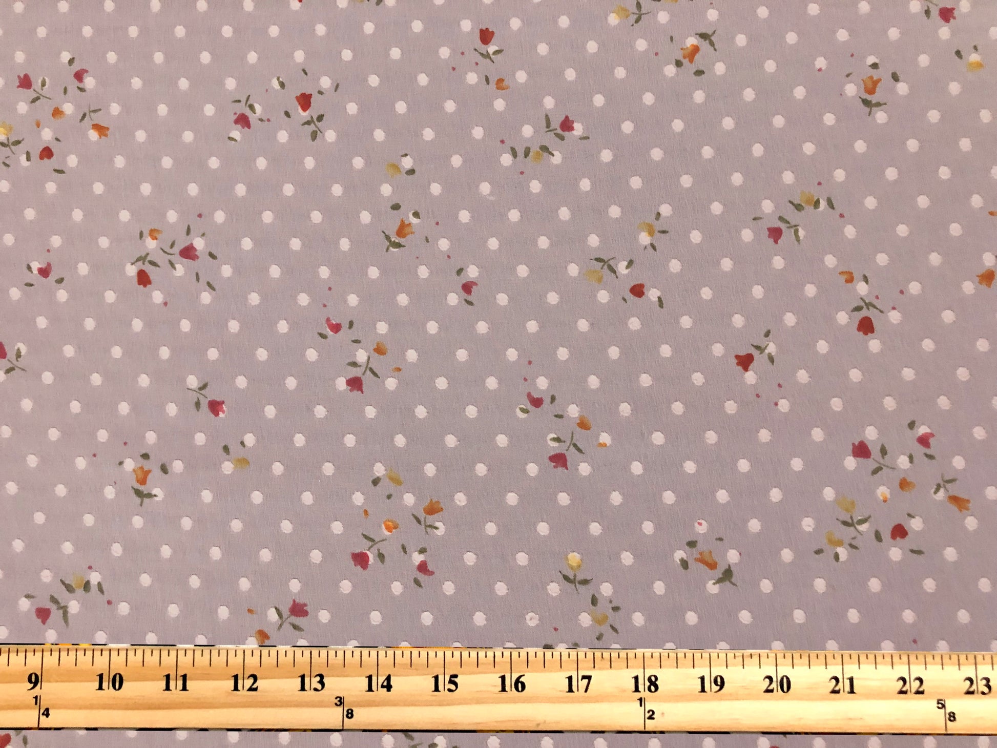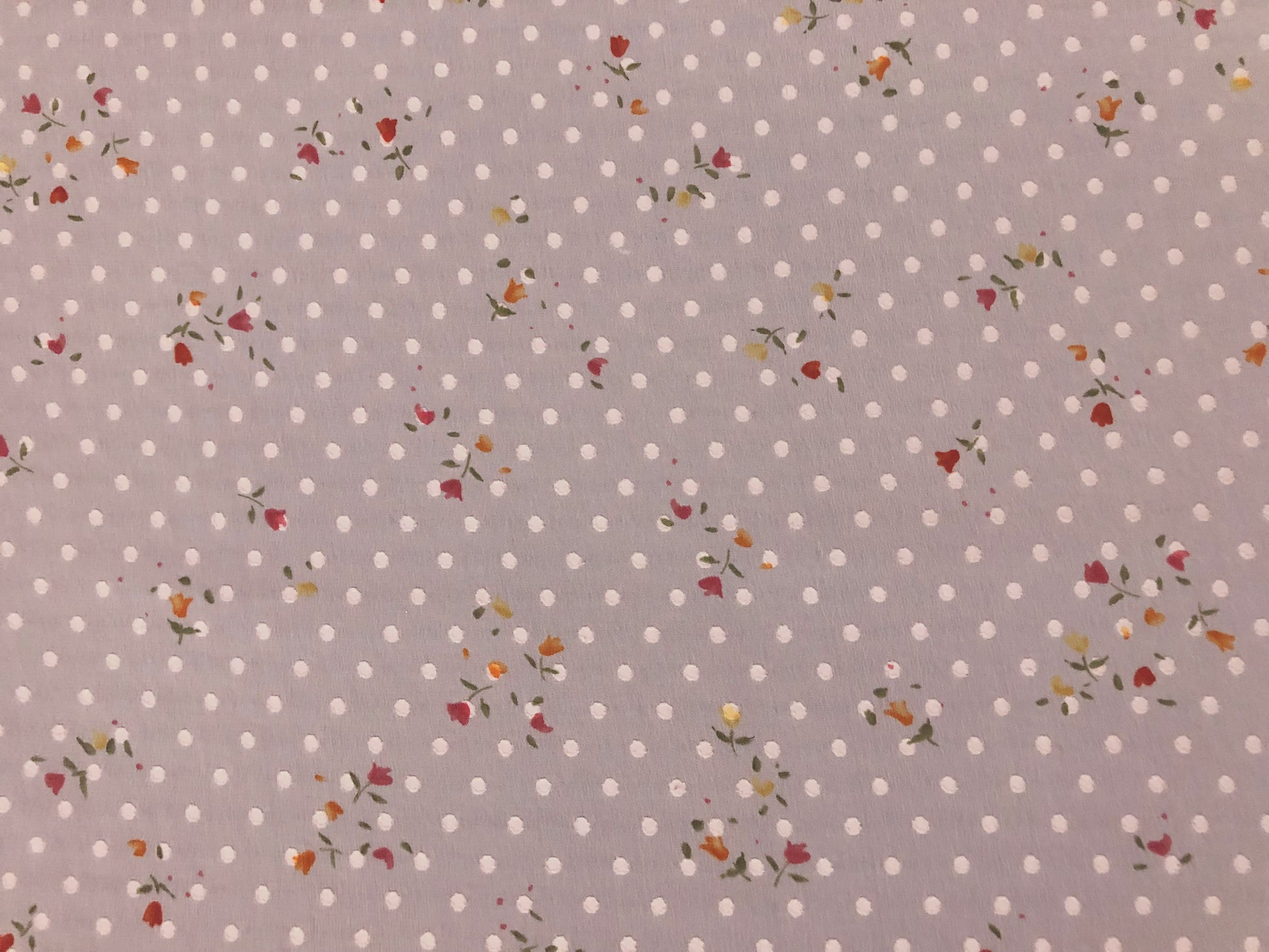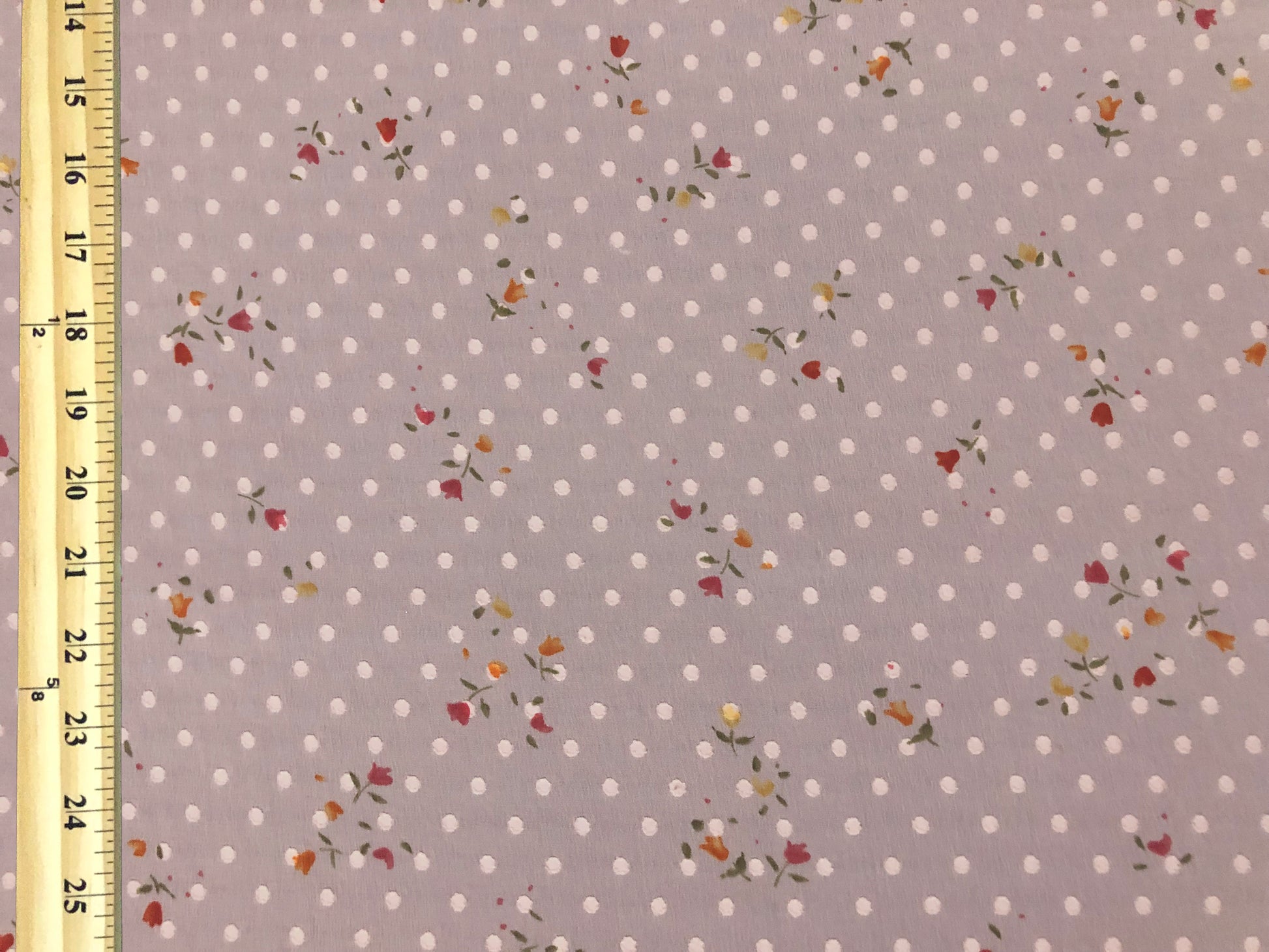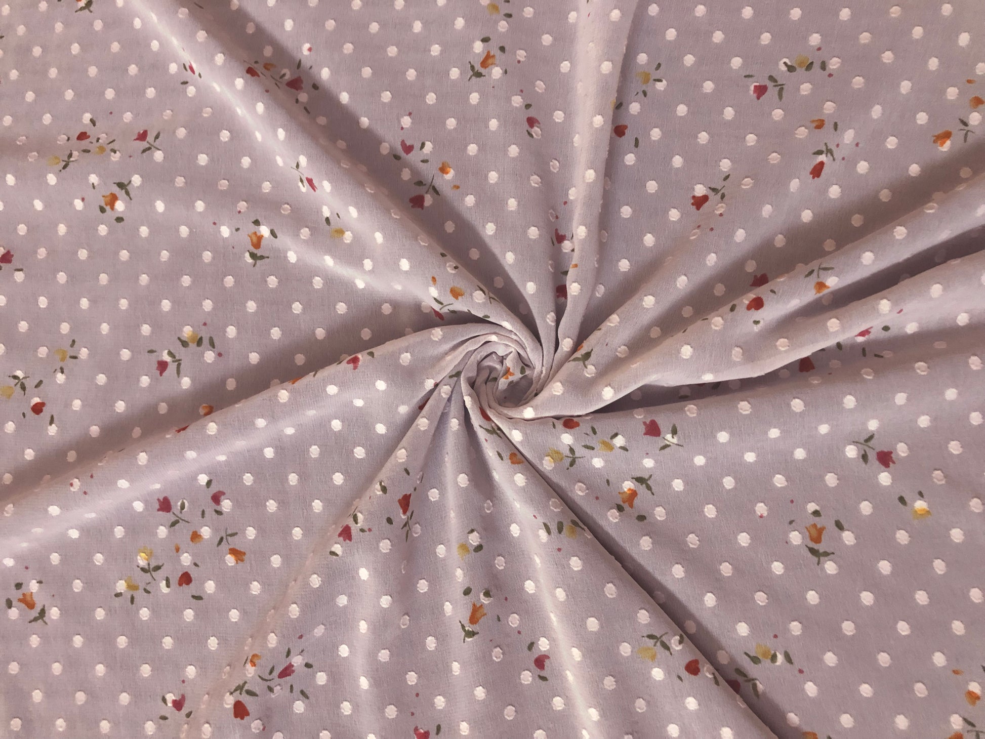✨ Airy, romantic, and effortless. This chiffon layers a classic Swiss-dot texture over a soft dove-pink ground with tiny multi-color floral sprigs—perfect for flutter sleeves, tiered skirts, and dreamy overlays.