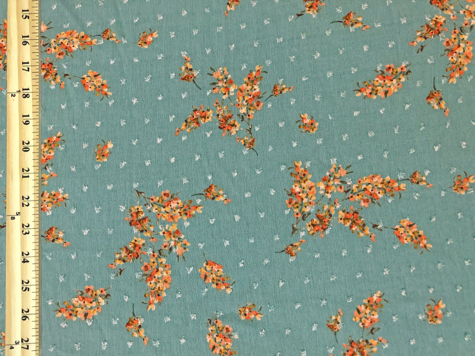 Dusty Green Swiss Dot Rayon Gauze with Orange Wildflower Sprigs — 100% Rayon, 52″ Wide — Fabric by the Yard (RGZPR016)