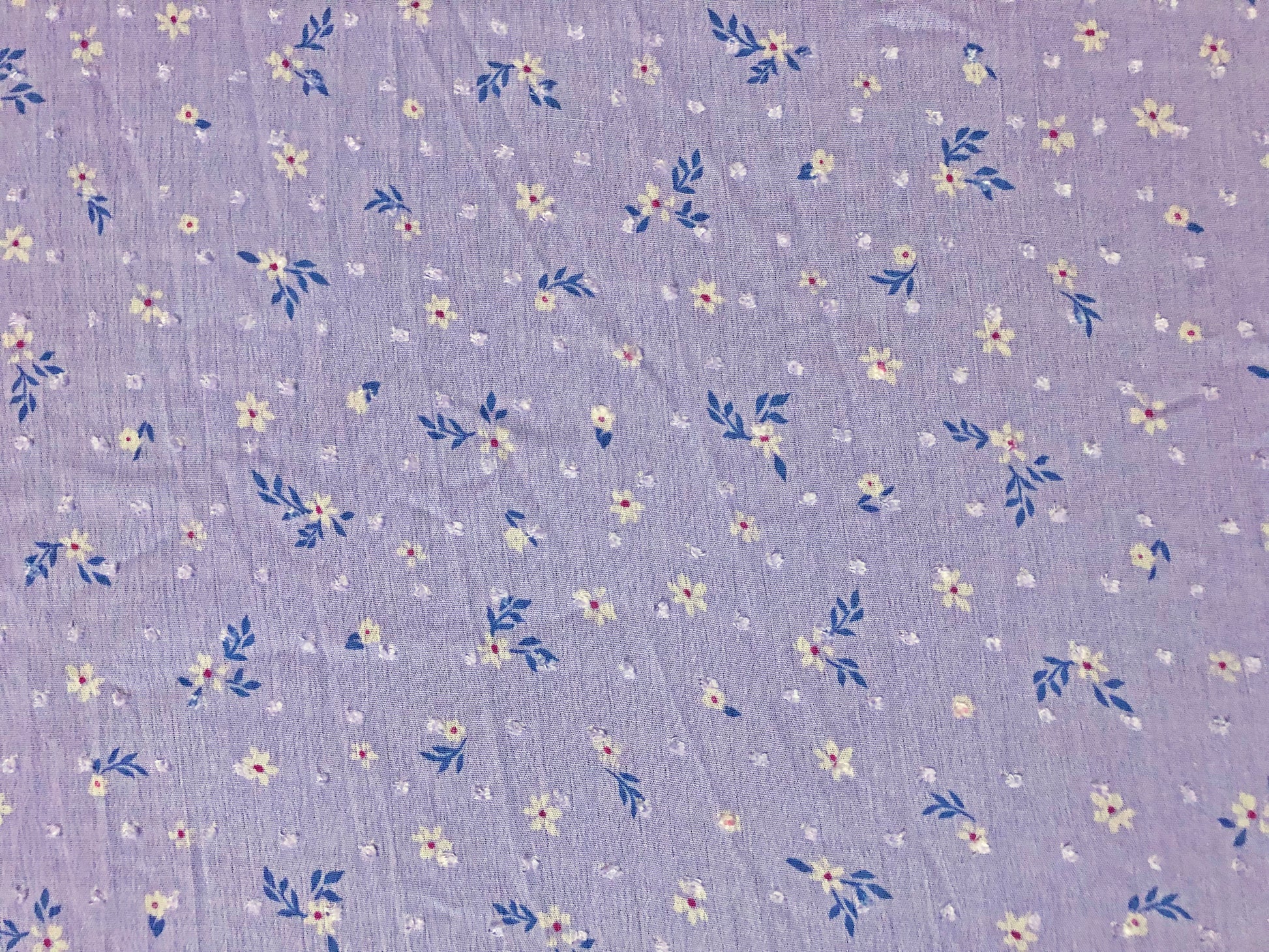 💜 Soft & charming: Lavender base with classic Swiss dots and scattered white ditsy florals with blue leaves—sweet, vintage vibe.