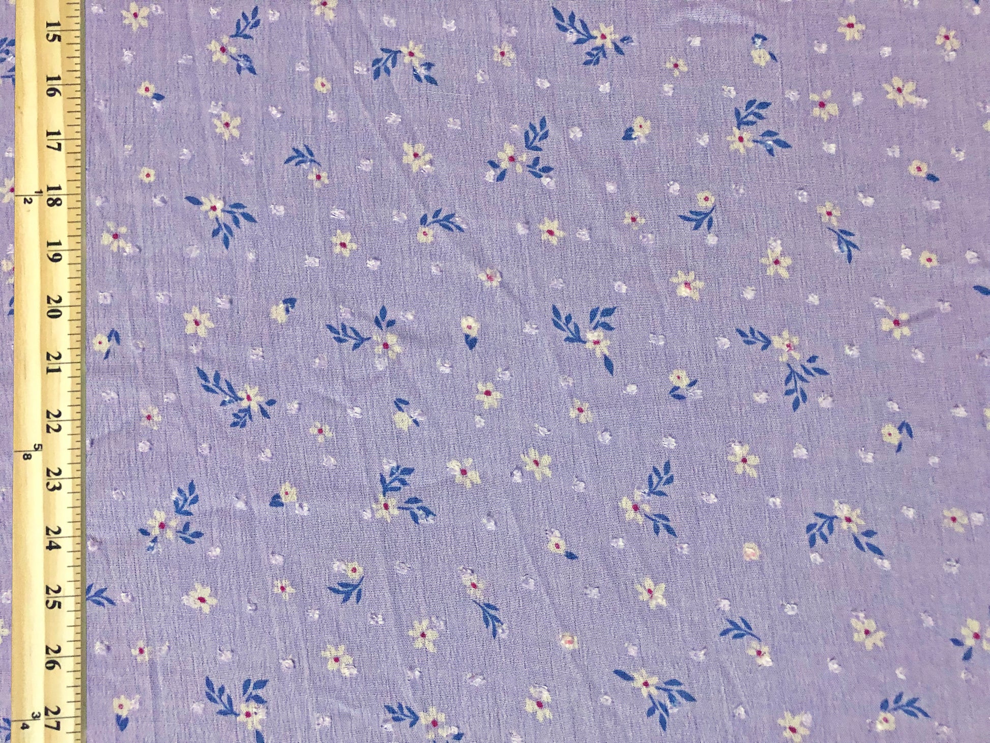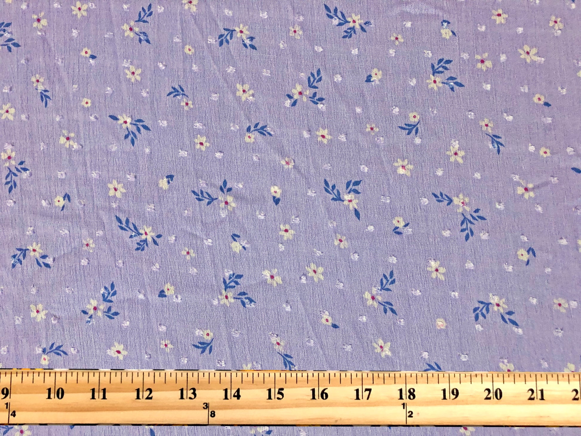 Lavender Swiss Dot Rayon Gauze with White Ditsy Florals & Blue Leaves — 100% Rayon, 52″ Wide — Fabric by the Yard (RGZPR010)
