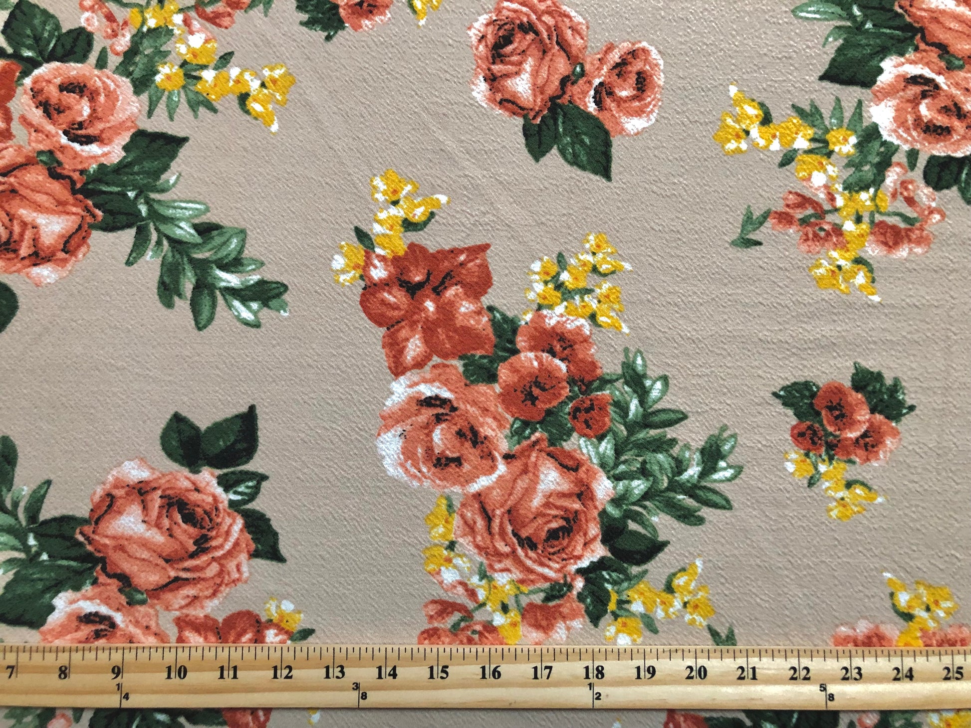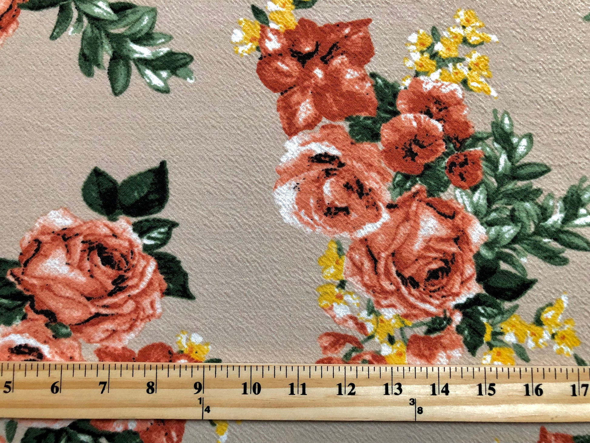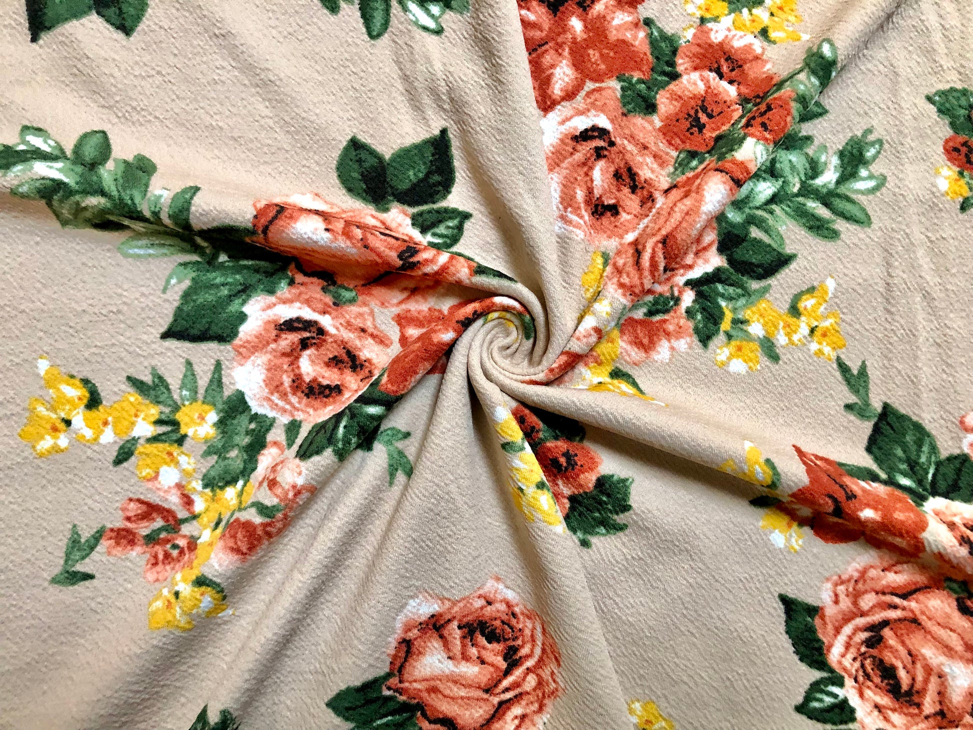 Liverpool Knit Printed Fabric-Beige Red Yellow Green Roses-LVPR274-Sold by the Yard-Apparel Fabric