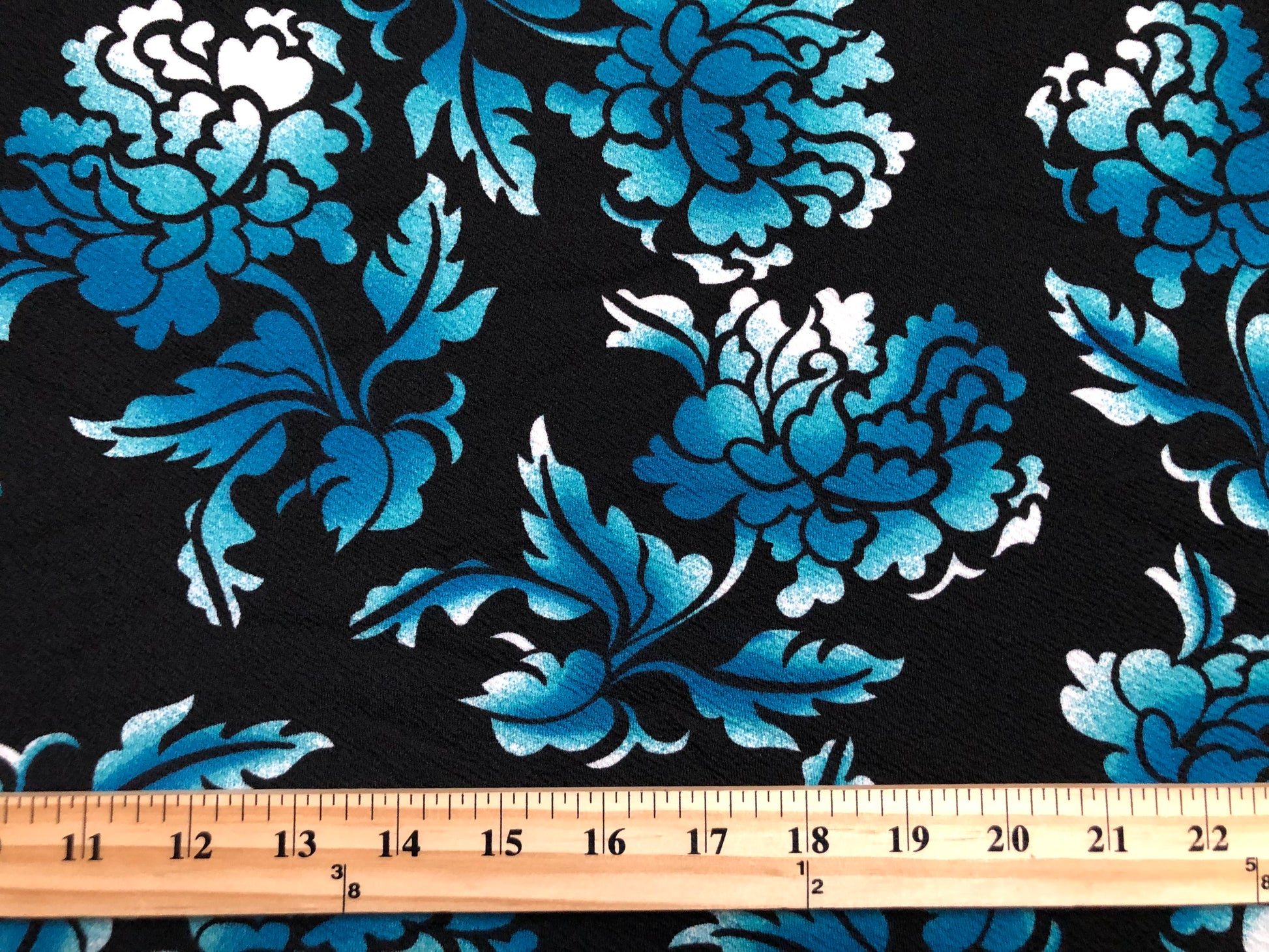 Liverpool Knit Printed Fabric-Black White Blue Shadowed Flowers-LVPR305-Sold by the Yard-Apparel Fabric