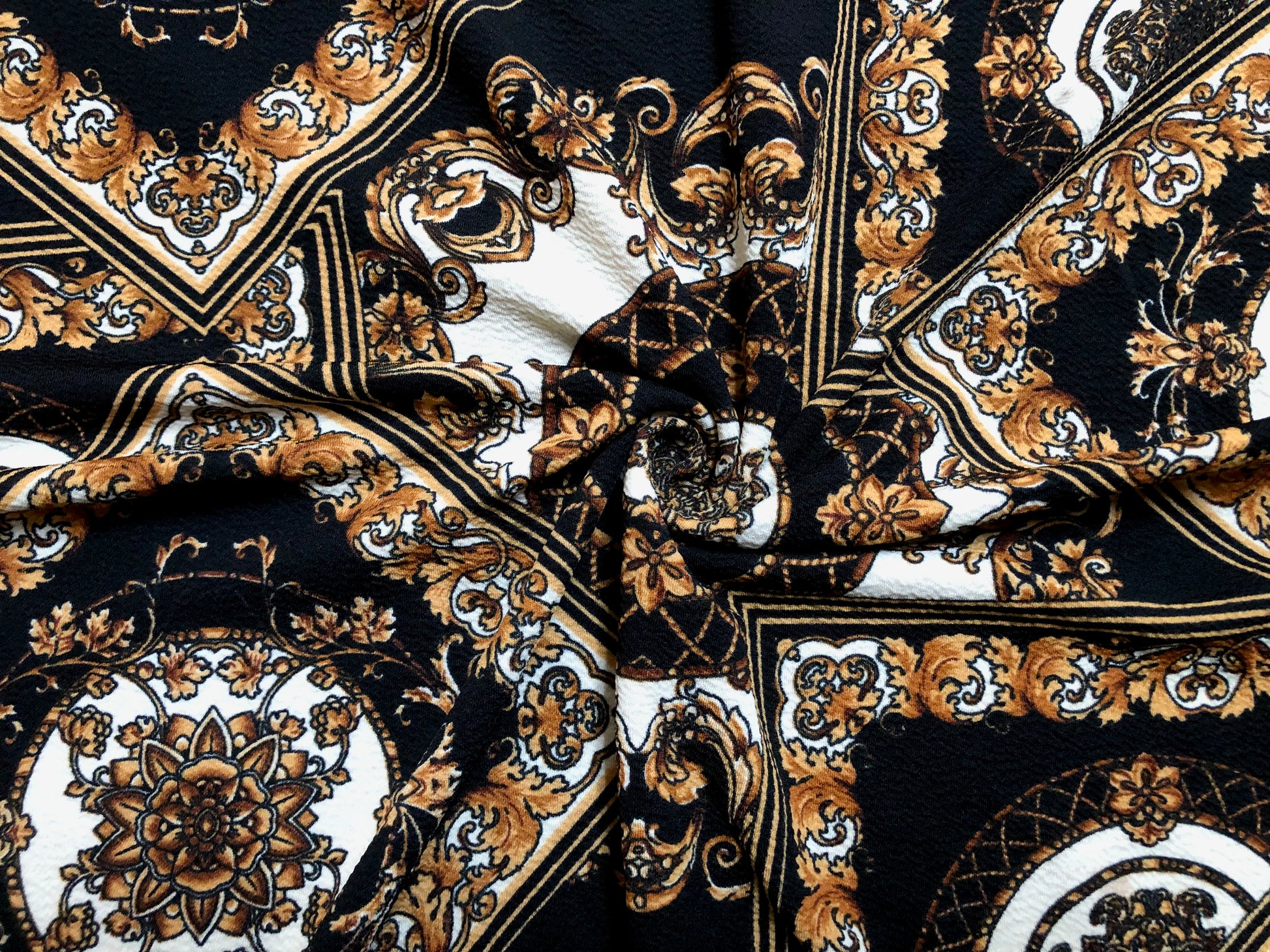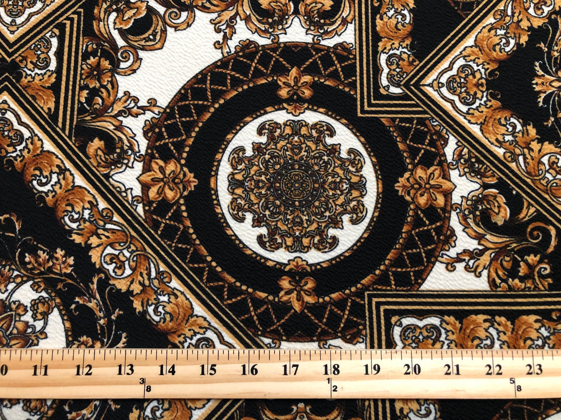 Liverpool Knit Printed Fabric-Black White Gold Arabic Mosaics-LVPR267-Sold by the Yard-Apparel Fabric