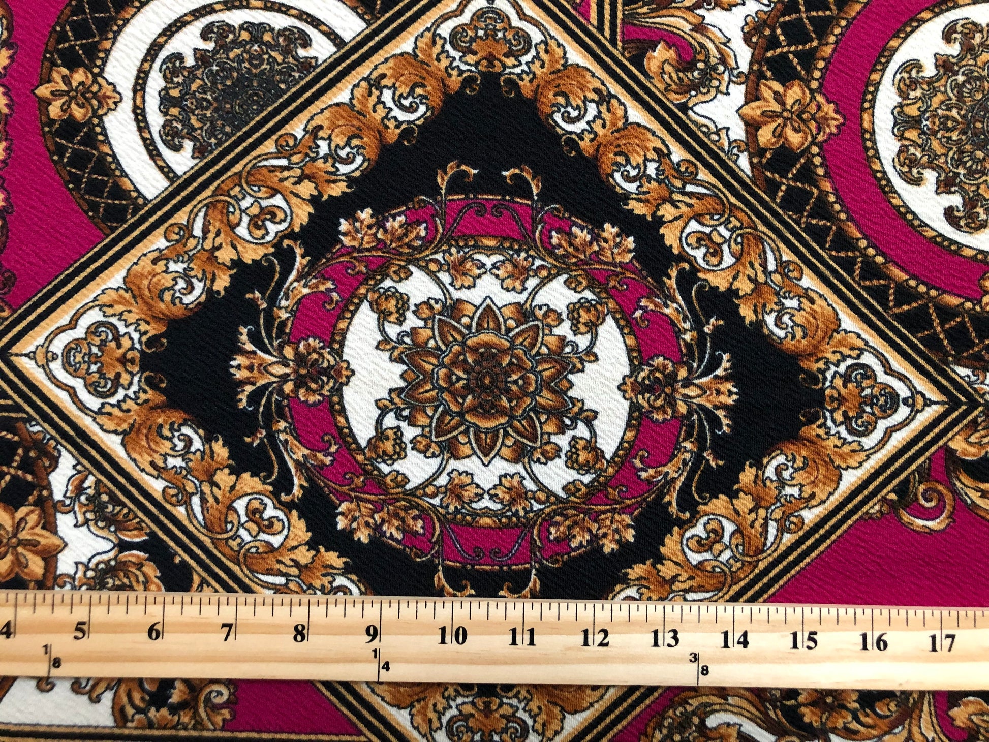 Liverpool Knit Printed Fabric-Magenta Gold Arabic Mosaics-LVPR292-Sold by the Yard-Apparel Fabric