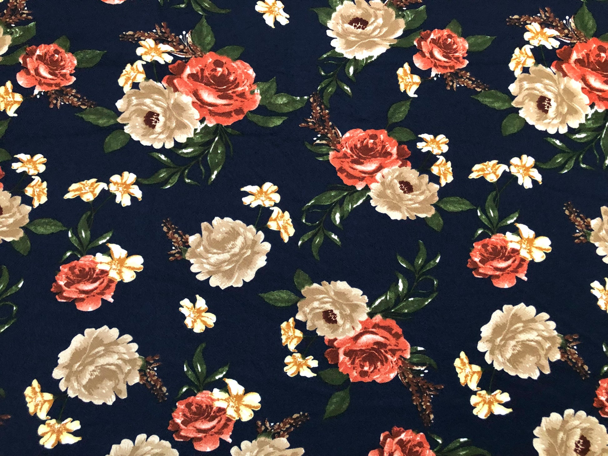 Liverpool Knit Printed Fabric-Navy Blue Brown Red Roses-LVPR279-Sold by the Yard-Apparel Fabric