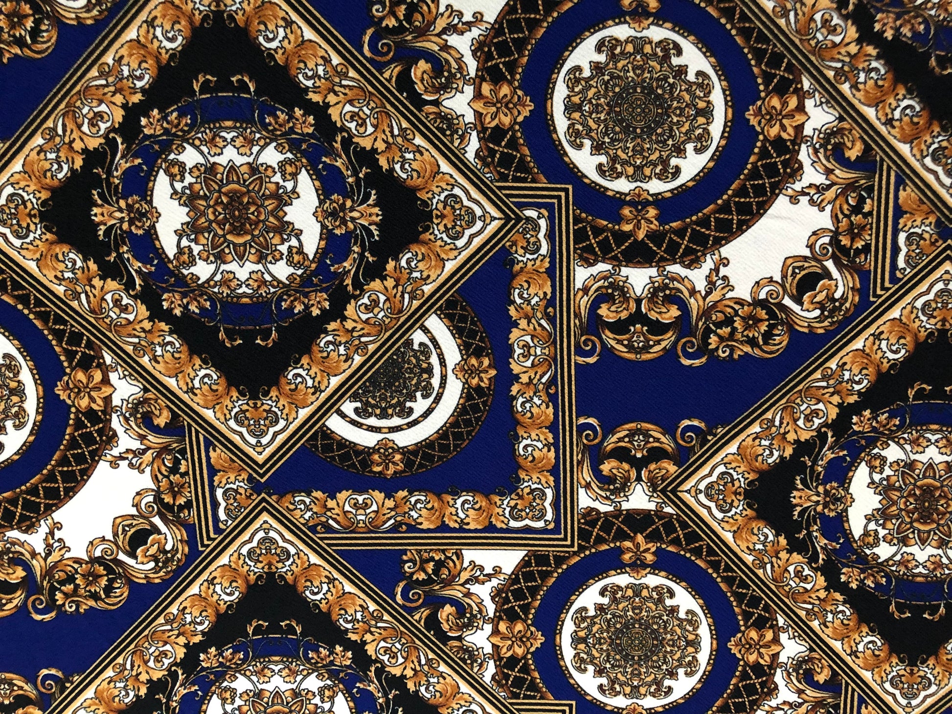 Liverpool Knit Printed Fabric-Navy Blue Gold Arabic Mosaics-LVPR291-Sold by the Yard-Apparel Fabric