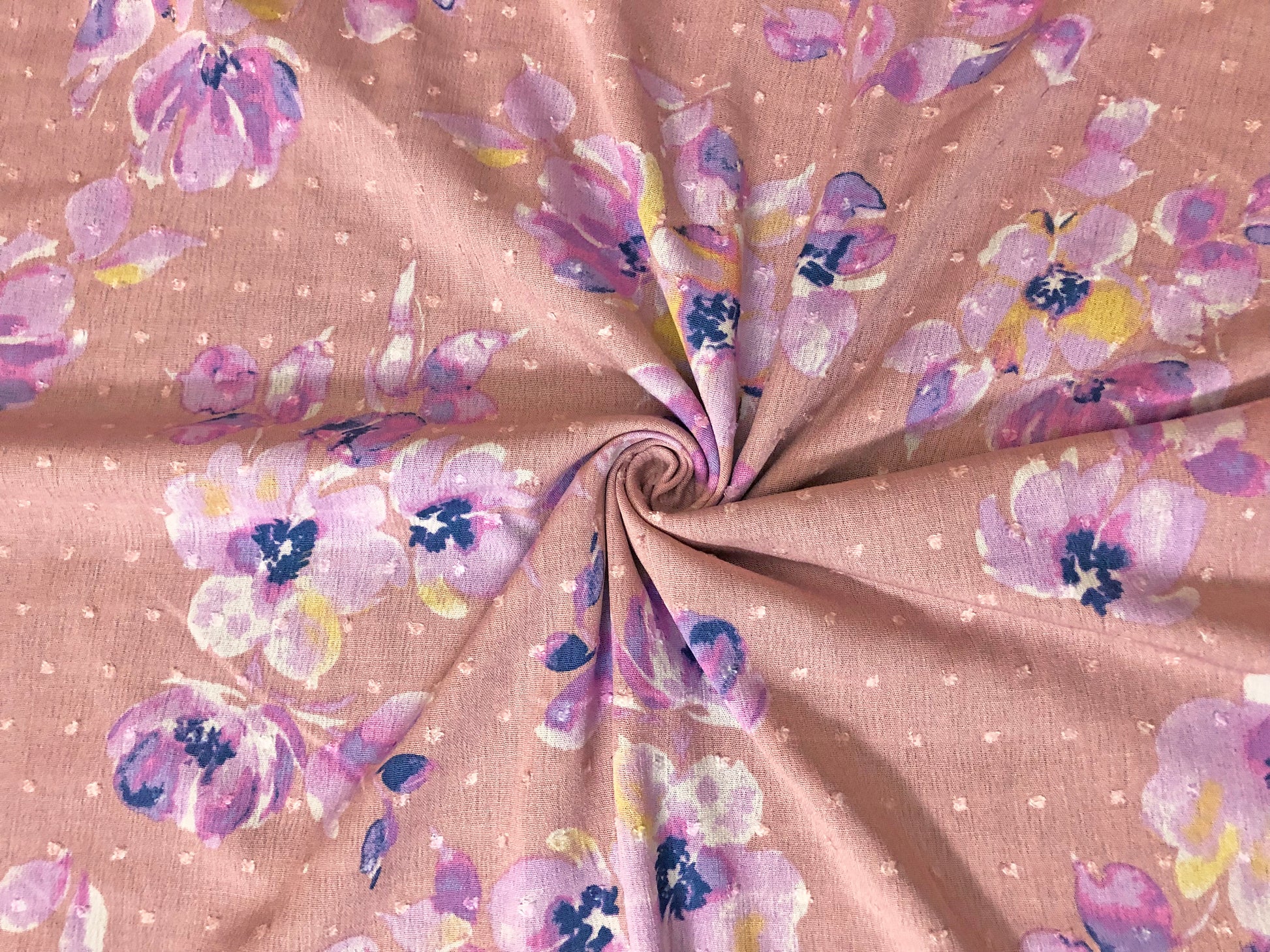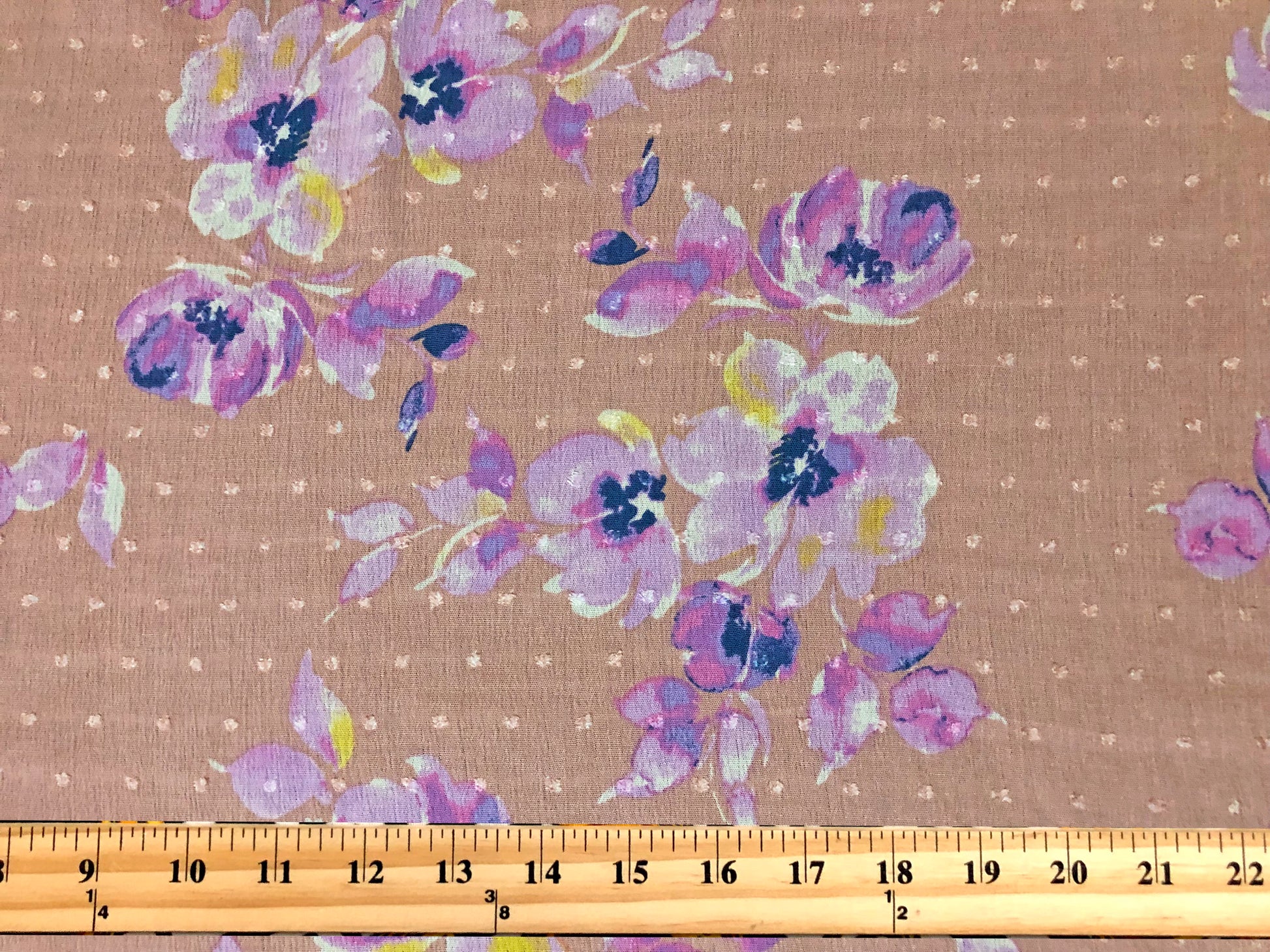 Melon Swiss Dot Rayon Gauze with Lilac & Purple Watercolor Florals — 100% Rayon, 52″ Wide — Fabric by the Yard (RGZPR06)