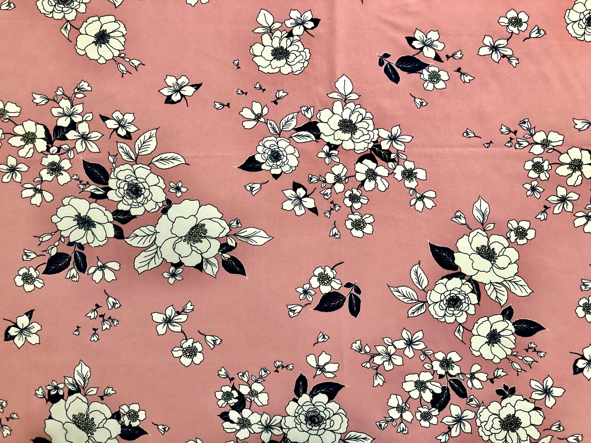 Fresh, feminine & endlessly wearable. This smooth rayon twill features white line-art blossoms and foliage on a warm pink ground. A fluid drape and light stretch make it perfect for elevated everyday garments and accessories.